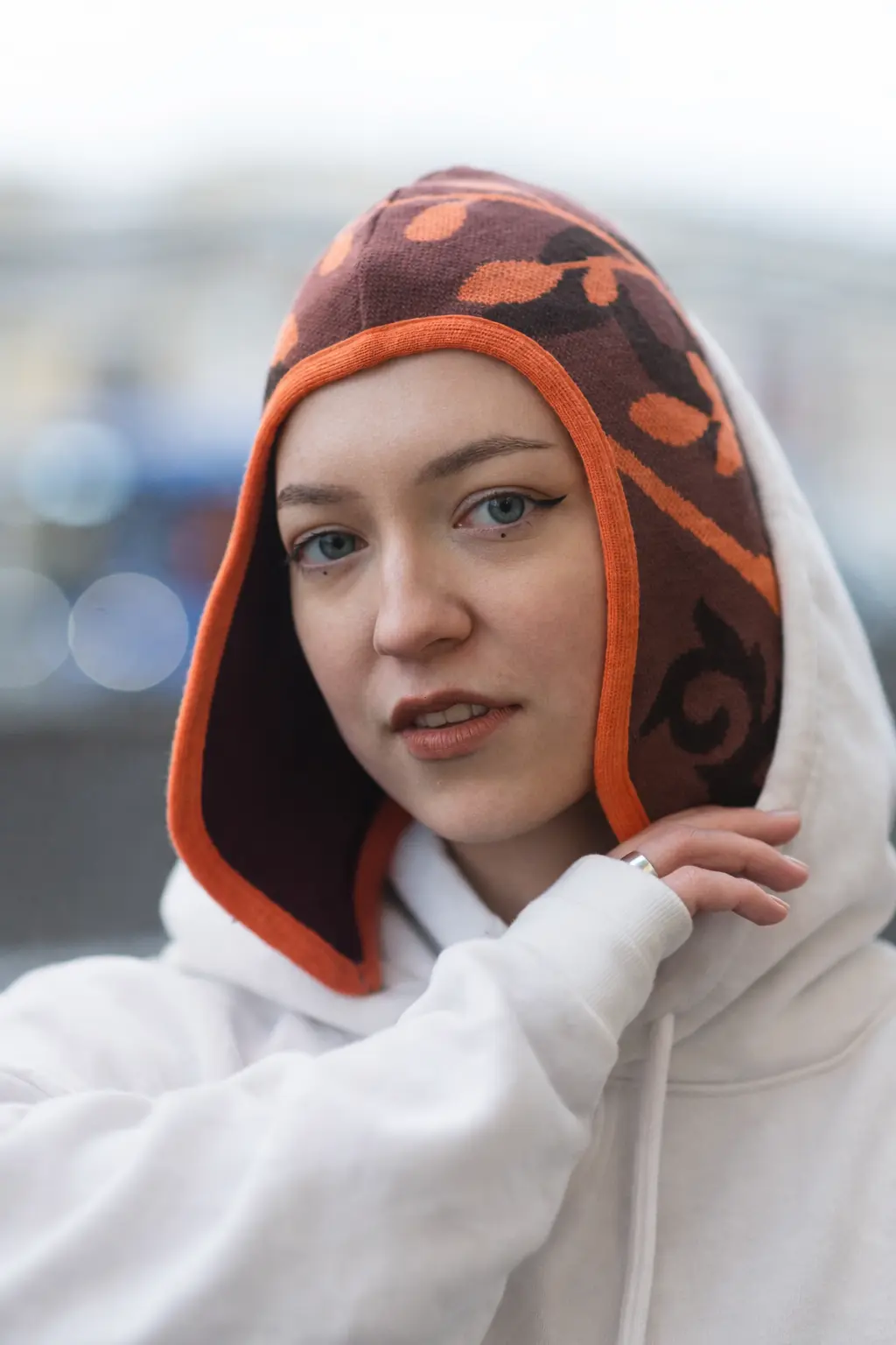 Шапка выполнена в узнаваемом формате мягкого капюшона с чёткими удлинёнными панелями, которые защищают щеки и шею. Купол имеет выверенную анатомическую посадку, идеально повторяя форму головы. Удлинённые элементы добавляют силуэту гармонии и лёгкого драматизма.