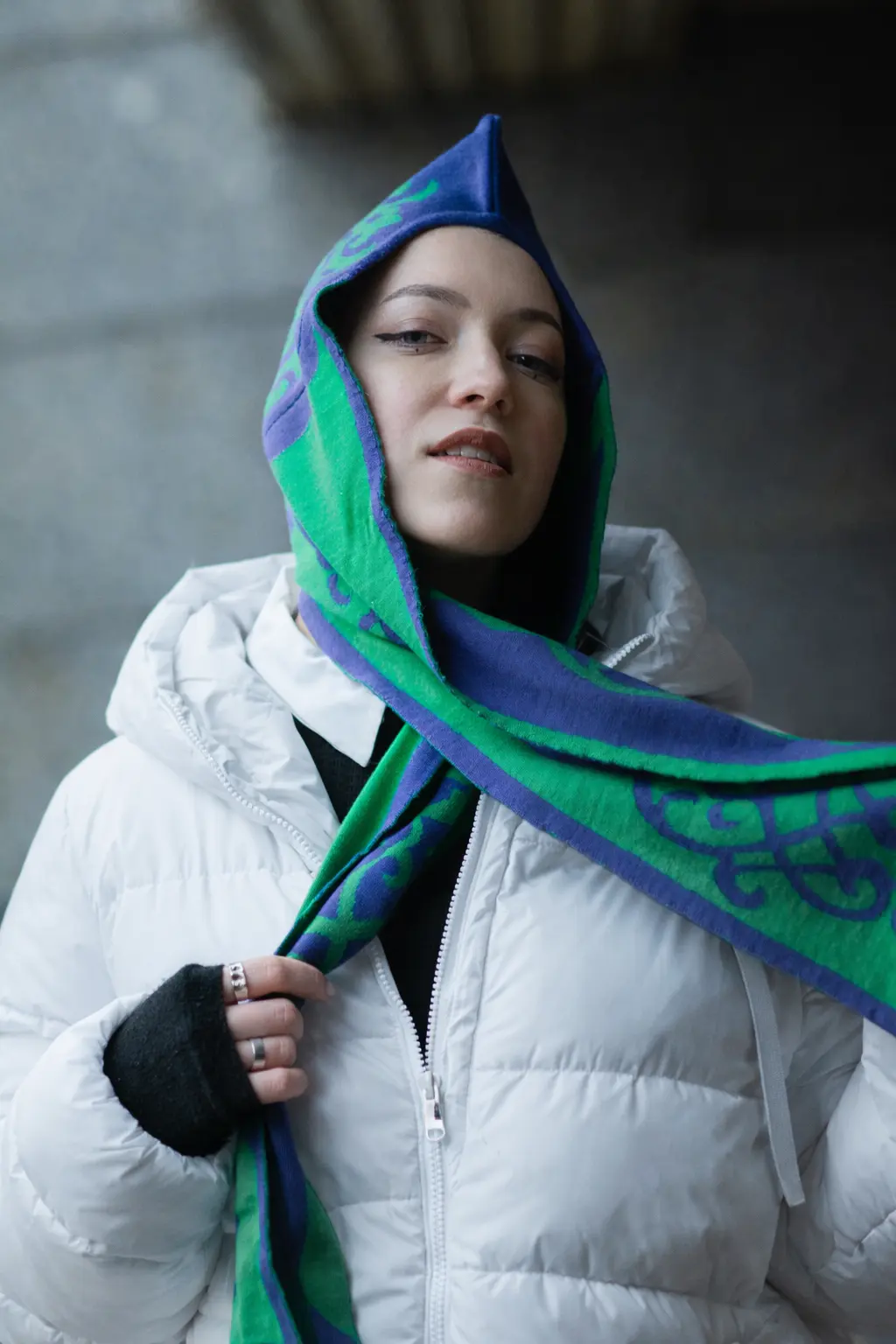 Эта шапка идеально подходит для образов в стилях ethnic futurism, neo-nomad, conceptual streetwear, art performance fashion. Она будет великолепно смотреться с длинными плащами, oversize пальто, парками с графичной отделкой.