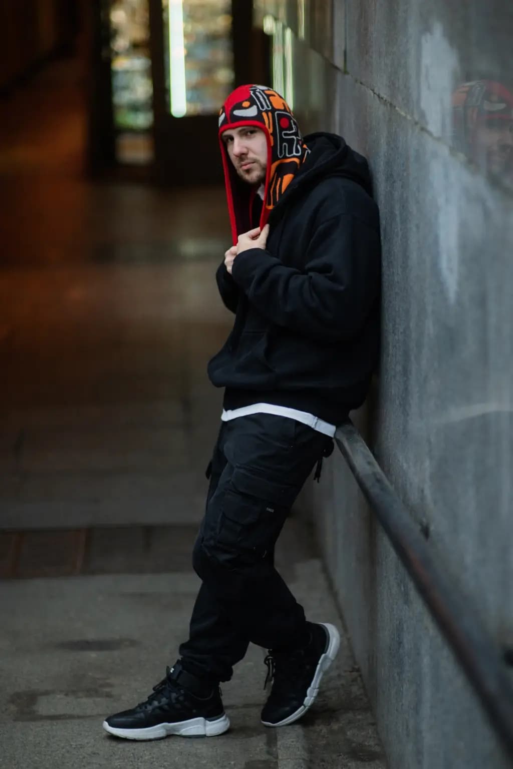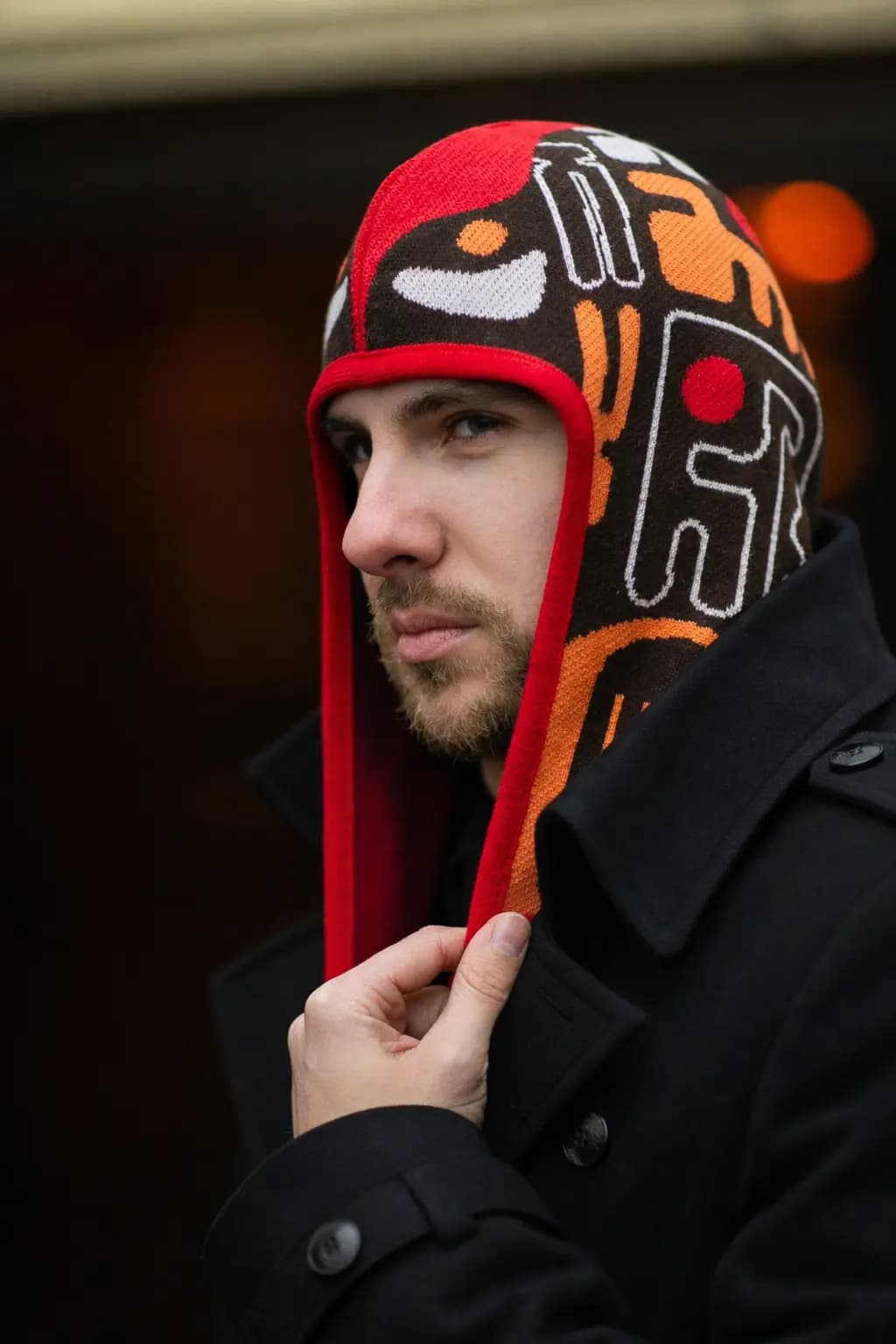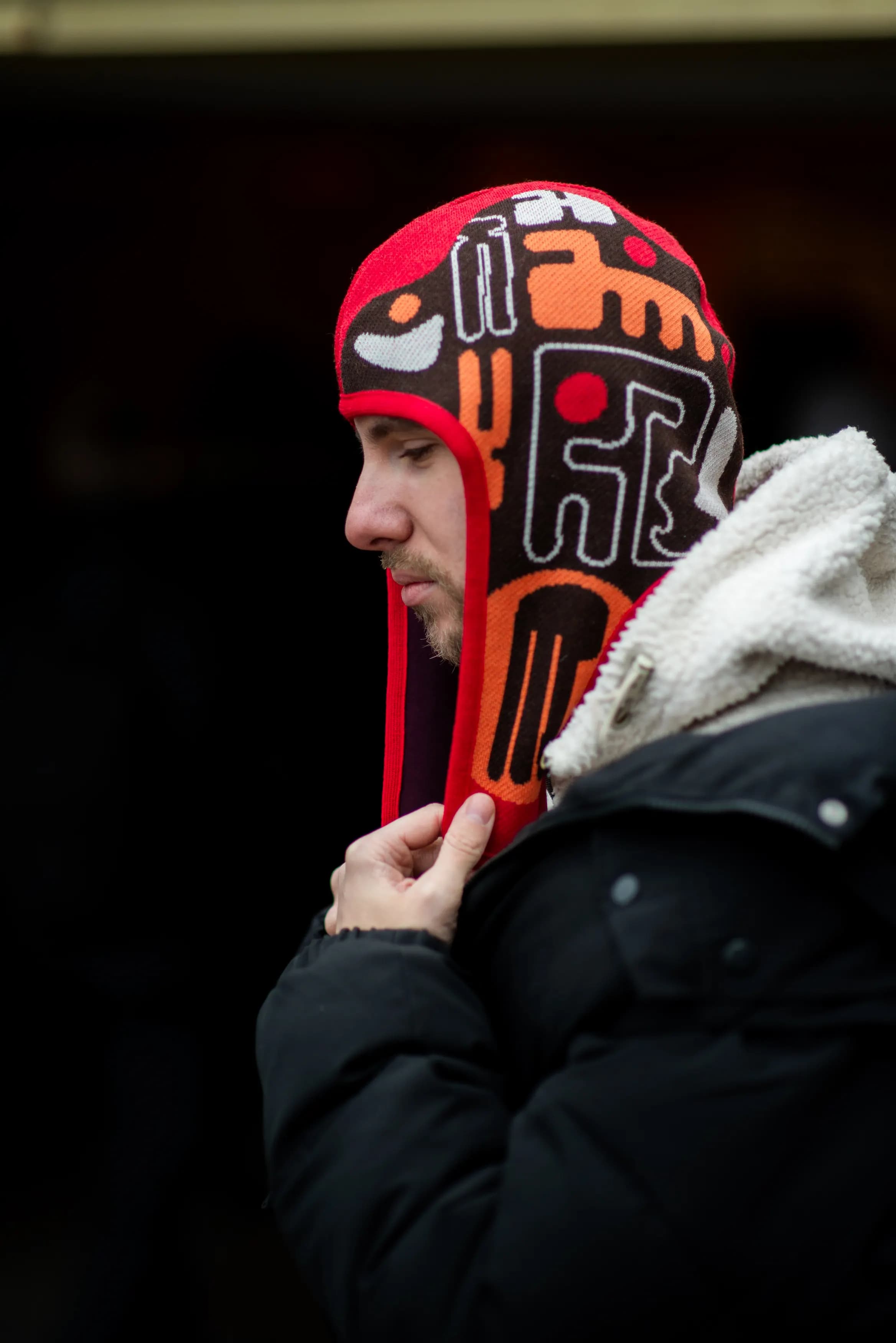 Красный, оранжевый, черный и белый оттенки создают энергичную контрастную палитру, где черный отвечает за глубину, красный - за искру жизни, охристо-оранжевый - за связь с камнем и землёй, а белый добавляет ориентир и световую опору. Это необычная шапка для тех, кто ищет стильный аксессуар с орнаментом, характером и сильной визуальной архитектурой.