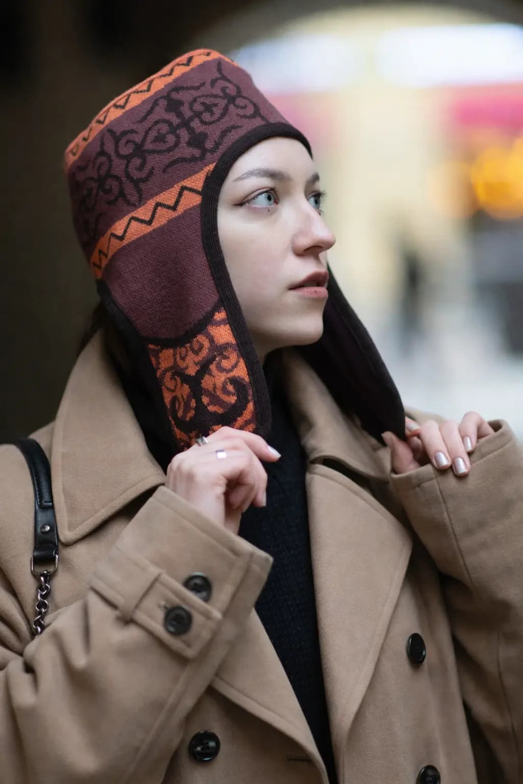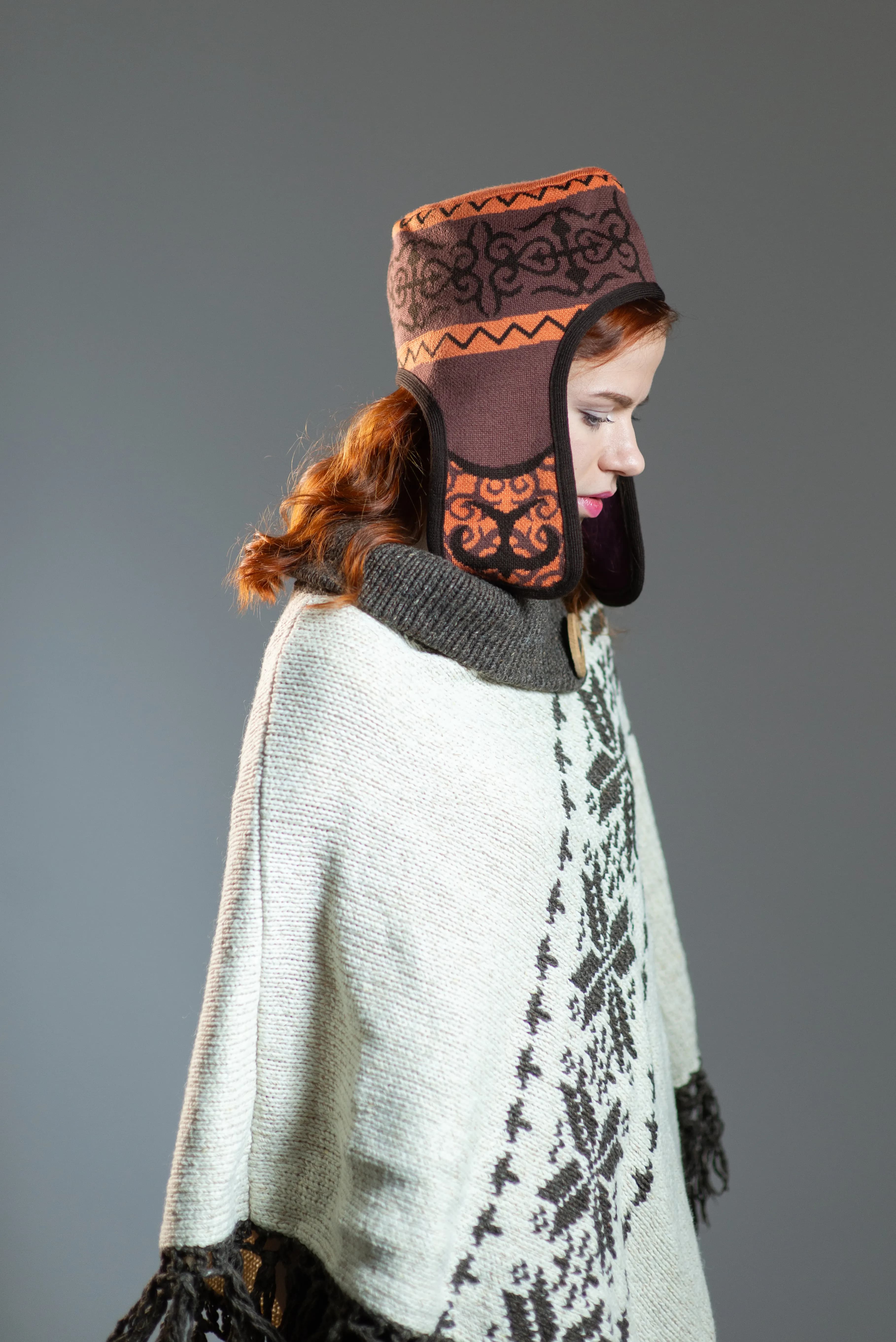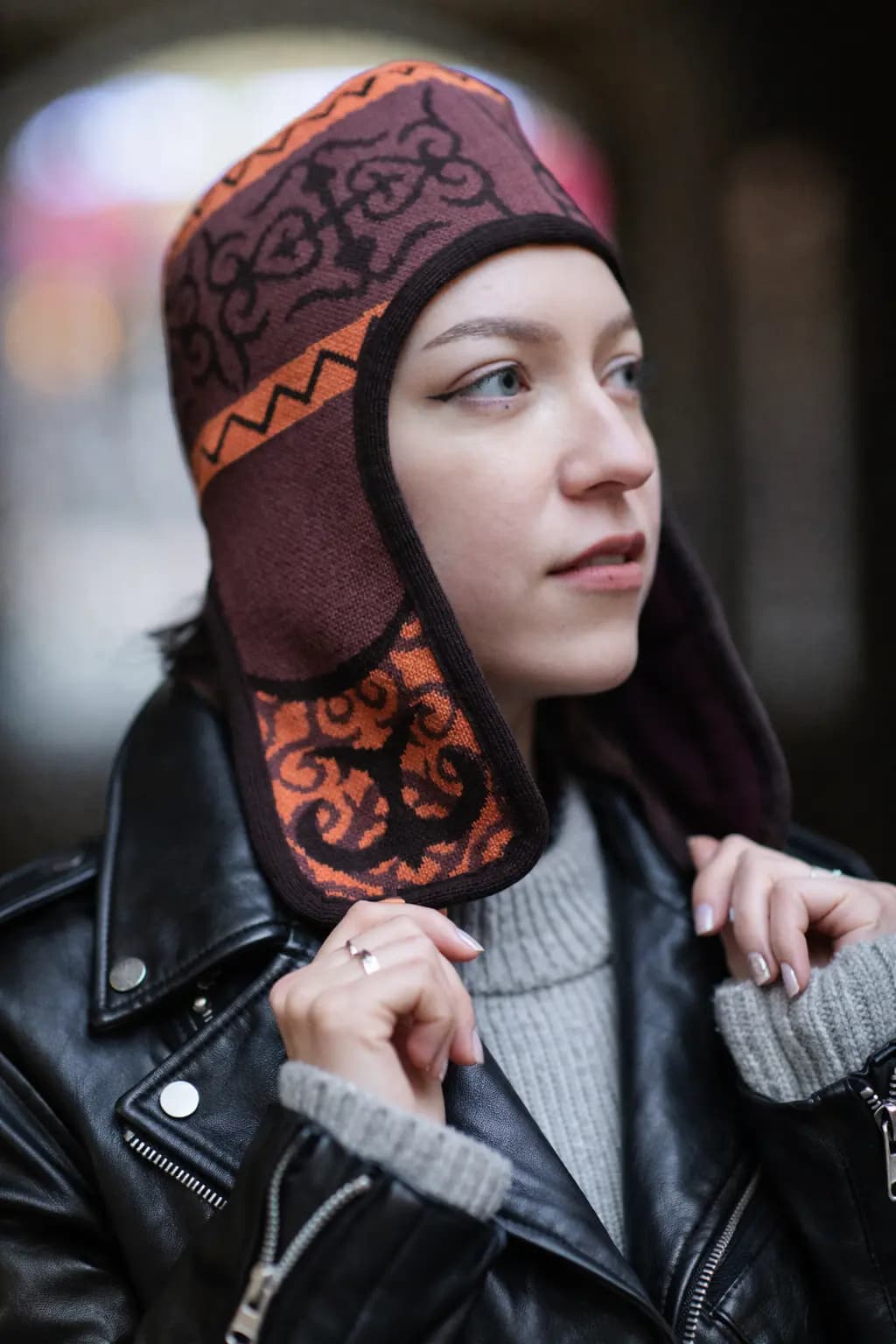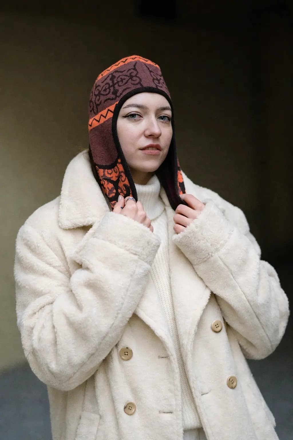 Оранжевые, коричневые и чёрные оттенки формируют тёплую, приземлённую палитру, где охра и земля дают ощущение родовой опоры и тепла, а тёмные акценты добавляют глубину и характер. Это необычная шапка с орнаментом для тех, кто ищет дизайнерскую вещь с сильной формой, этническим смыслом и актуальной городской подачей.
