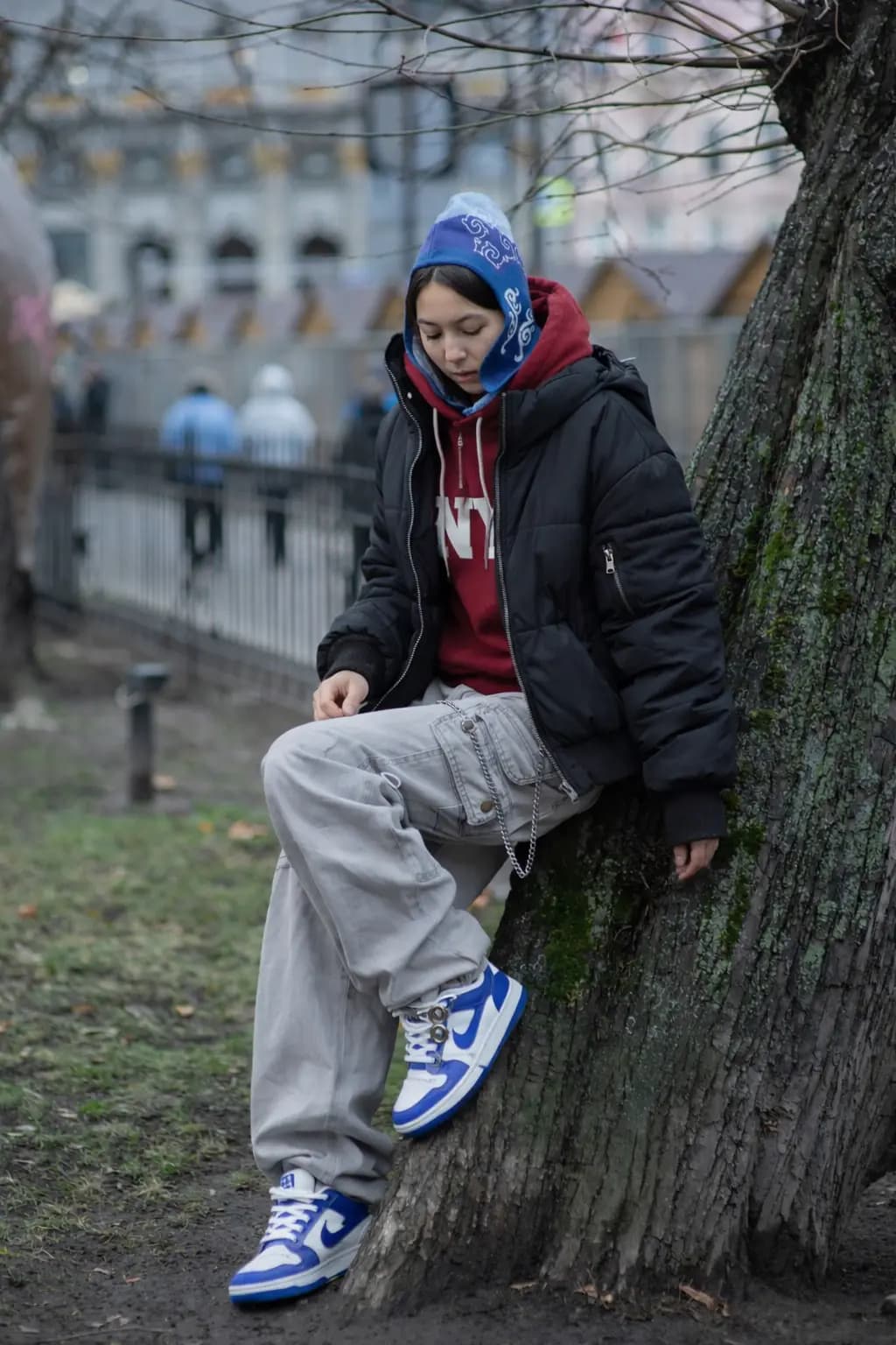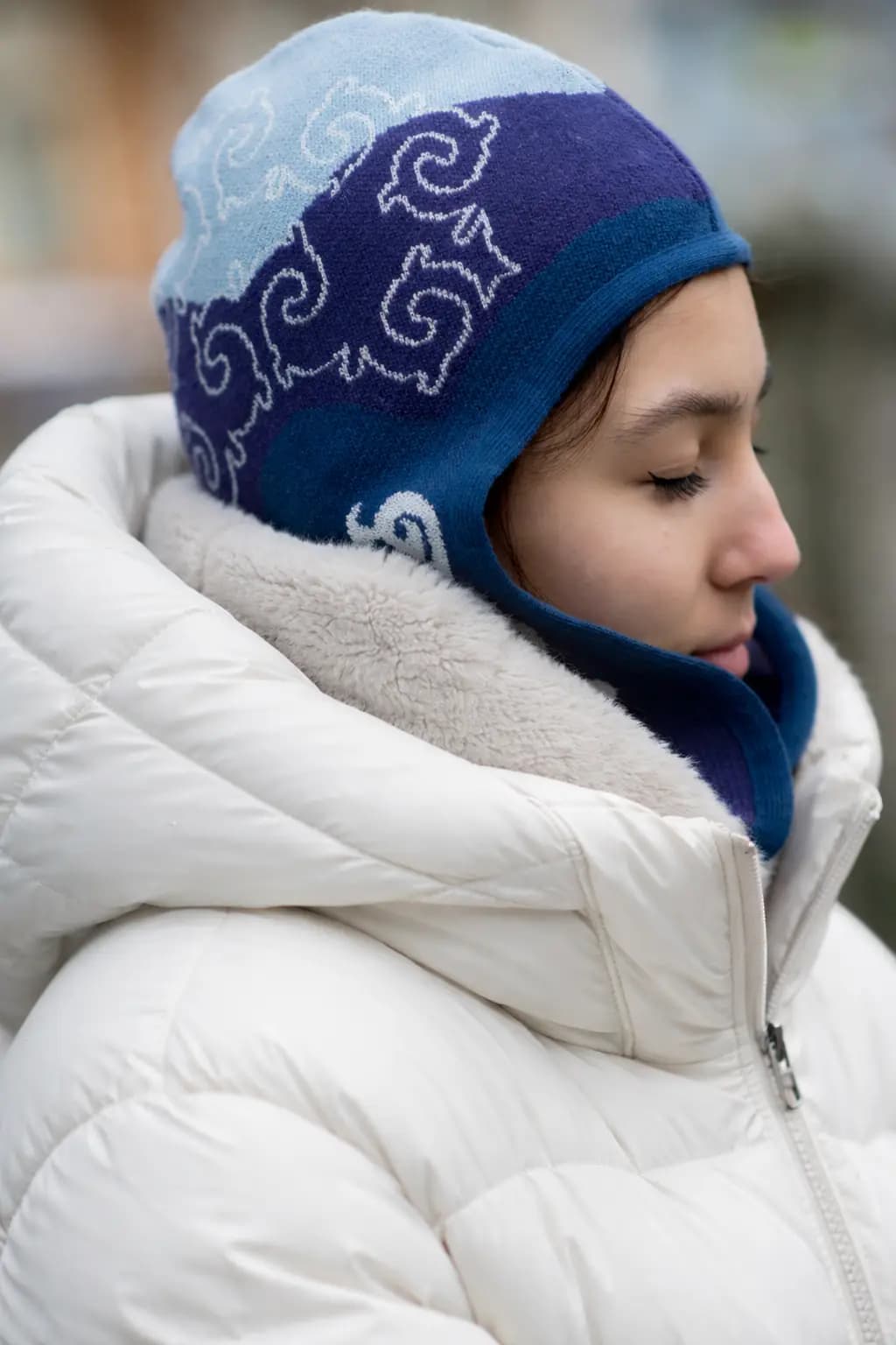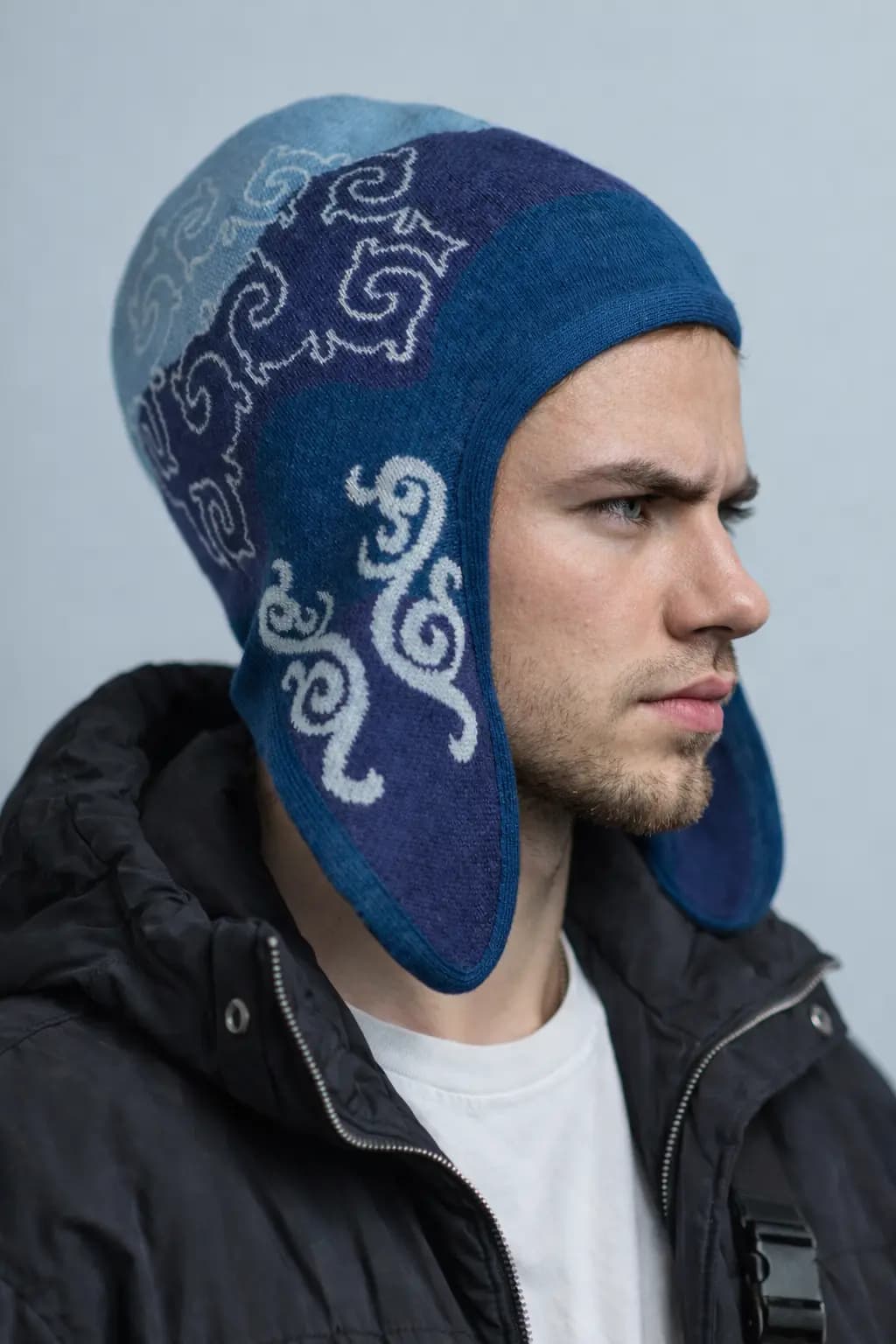 Голубые, темно-синие и белые акценты формируют чистую северную палитру с сильной графикой и ощущением движения под поверхностью. Это необычная шапка с орнаментом для тех, кто ищет дизайнерский головной убор, современную этно-форму и выразительную вещь для городских образов с характером.