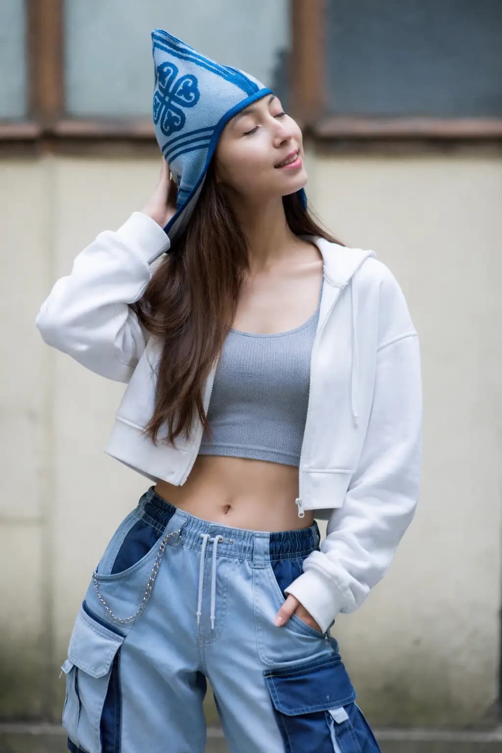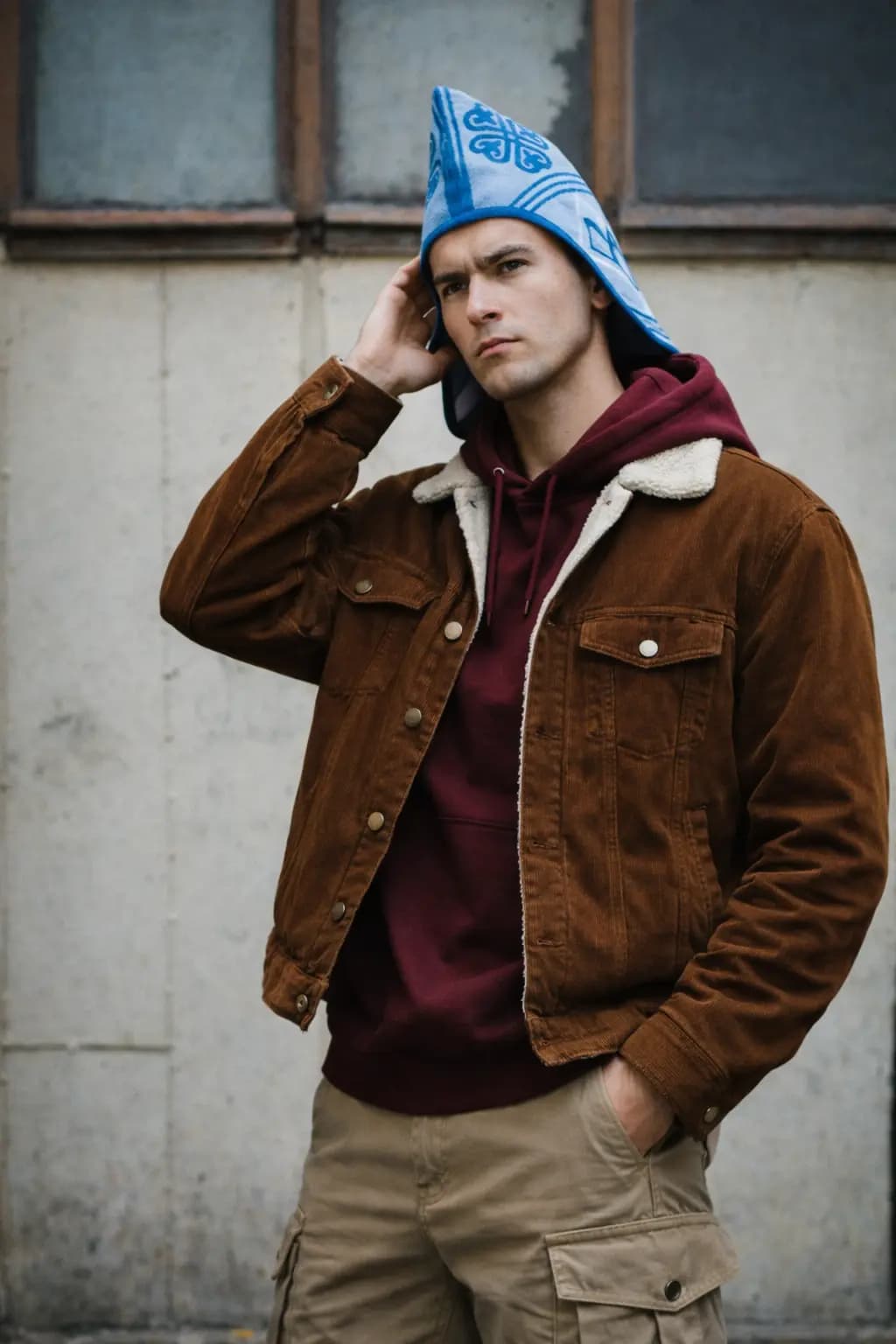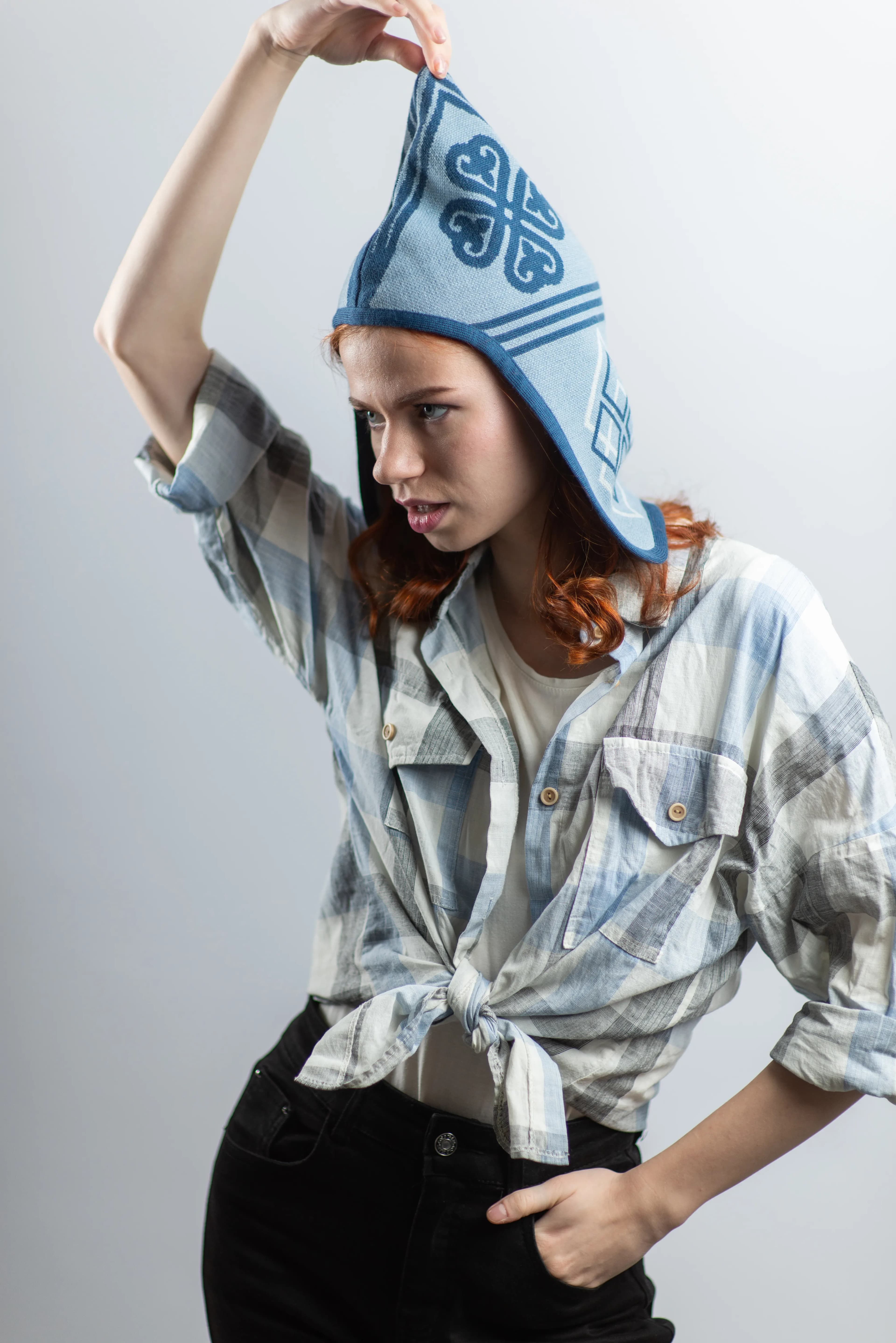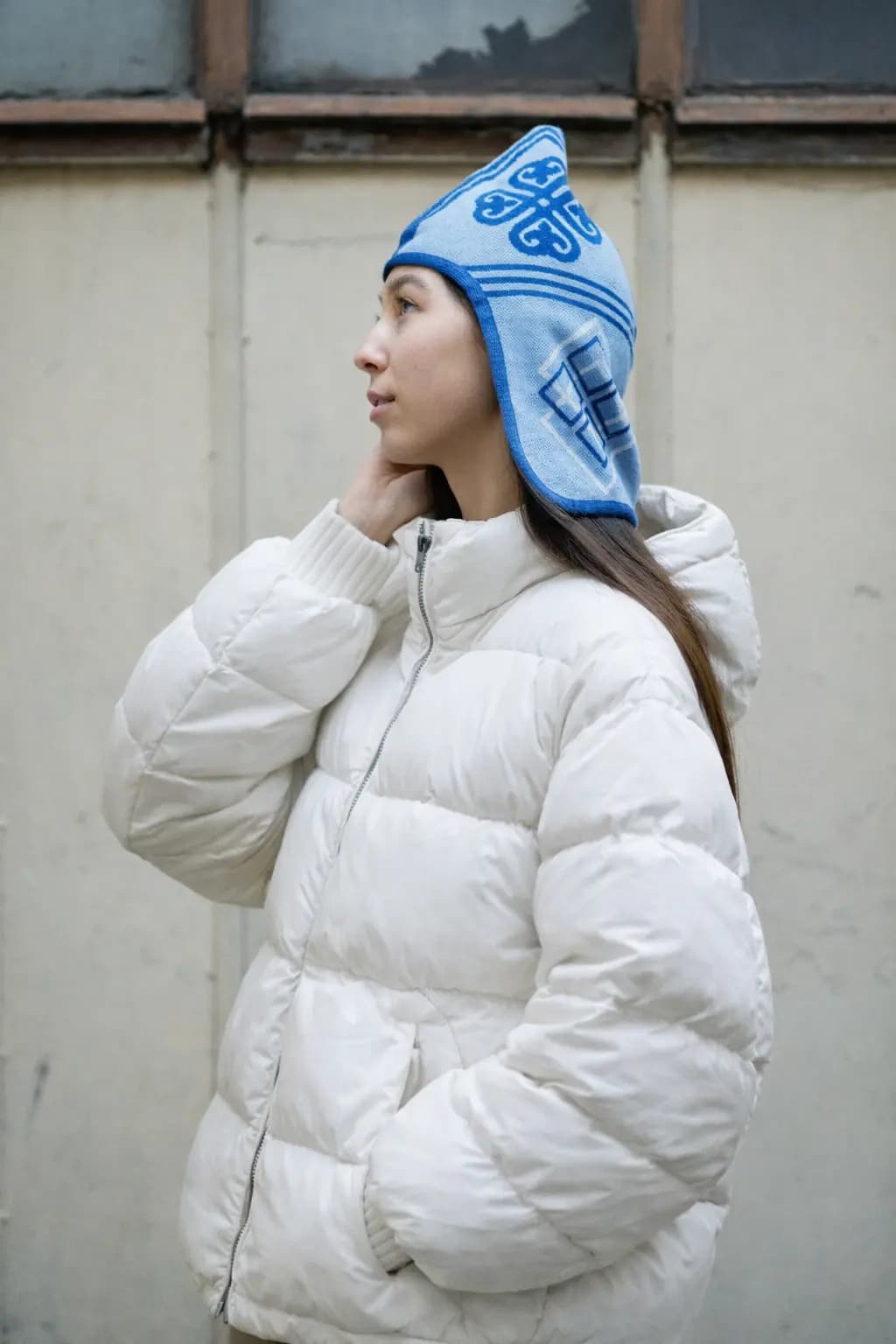 Светло-голубой и темно-синий оттенки создают чистую холодную палитру с ощущением ясности, глубины и внутреннего покоя. Это необычная шапка с орнаментом для тех, кто ищет редкую форму, дизайнерский акцент и современный этно-силуэт без случайных деталей.