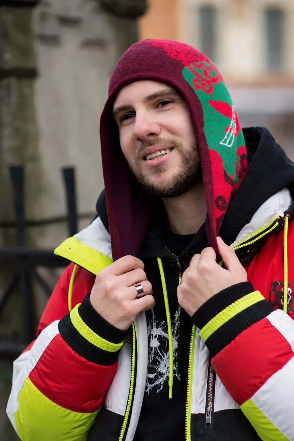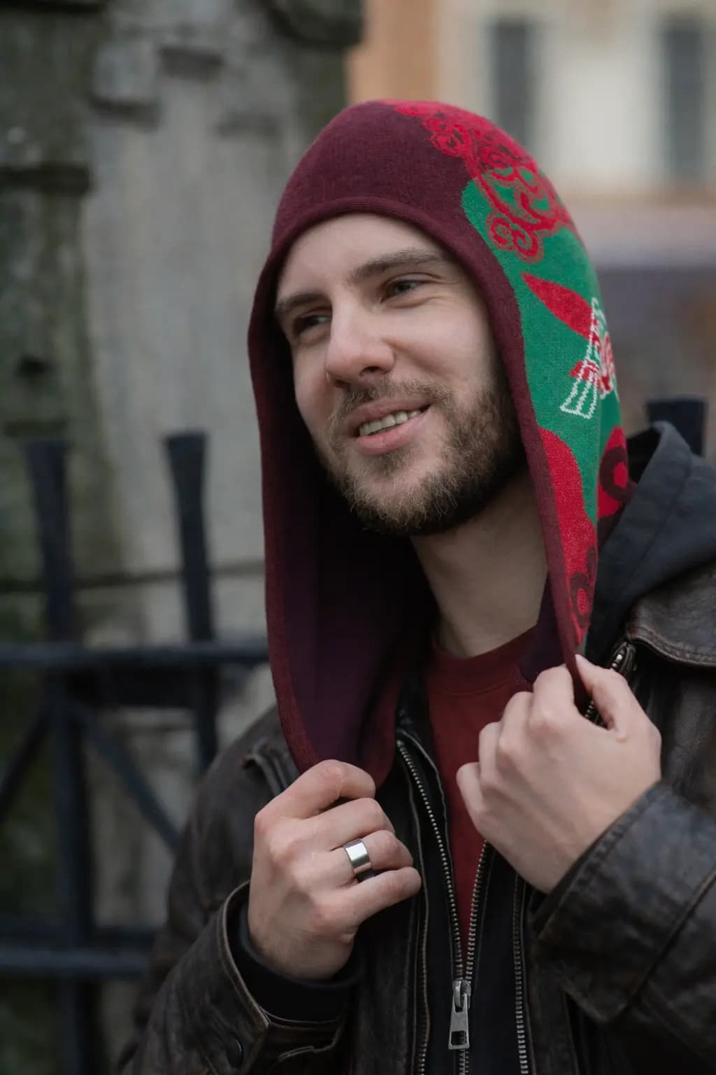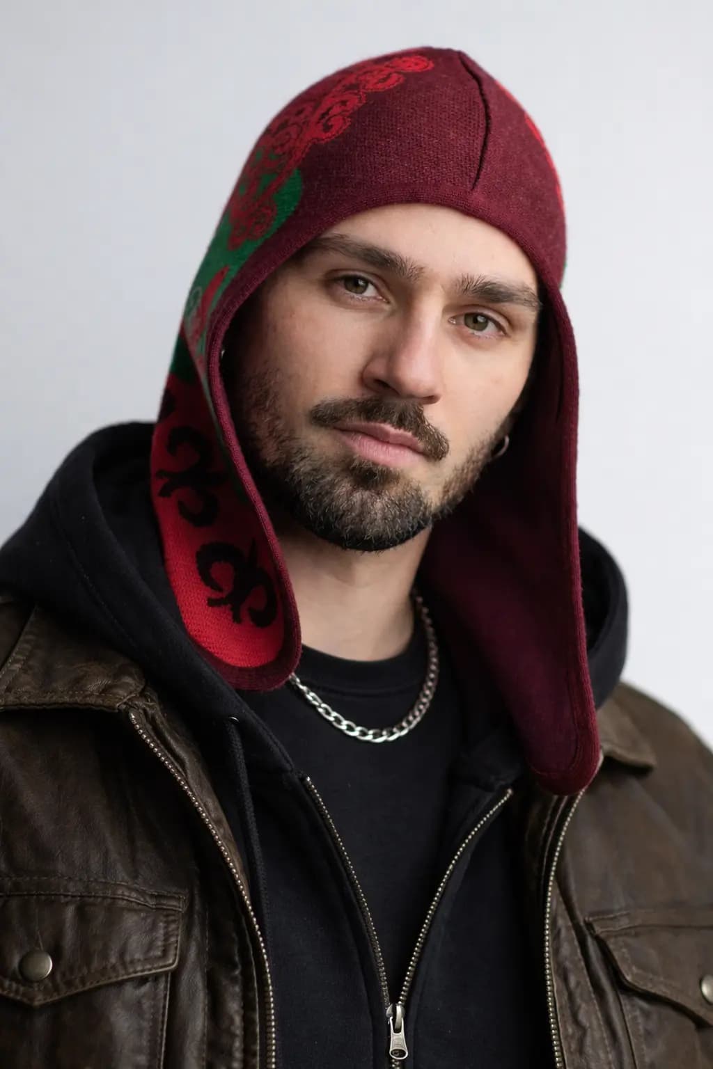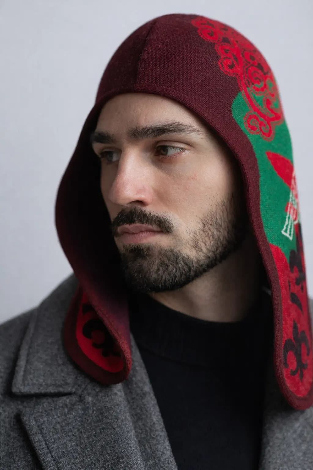 Зеленые, красные и белые акценты создают живую палитру с балансом тепла, чистоты и энергии. Это необычная шапка с орнаментом для тех, кто ищет дизайнерский головной убор с сильным арт-настроением, этническим смыслом и современной урбанистической подачей.